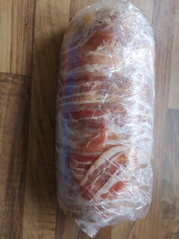 - Die Hähnchen-Rolle aus der Frischhaltefolie befreien.