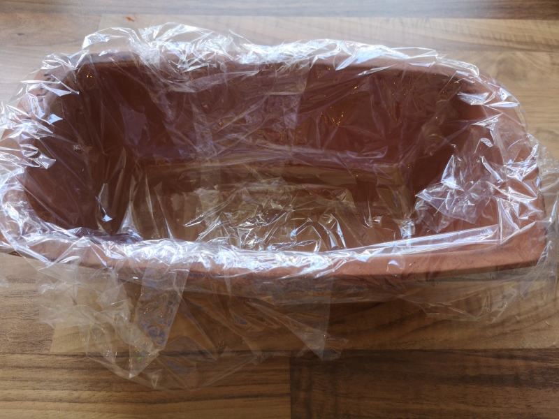 - Eine Kastenform mit Frischhaltefolie auskleiden.
