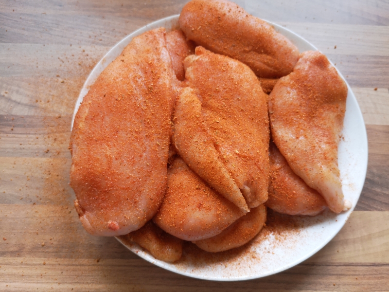 - Hähnchenbrust-Filet großzügig mit dem Hähnchen-Gewürzsalz würzen.