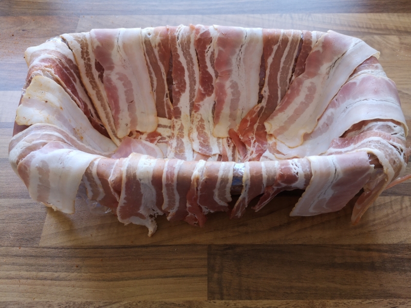 - Boden und Seiten der Kastenform mit Bacon auskleiden.