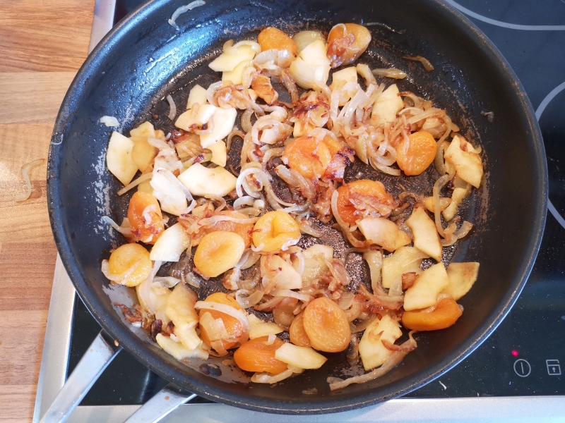 - Apfel und Ziebel in Scheiben schneiden und zusammen mit den Aprikosen anbraten.