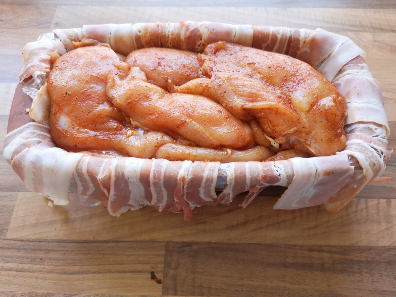 Kastenform mit Folie und Bacon und Hähnchenbrust.
