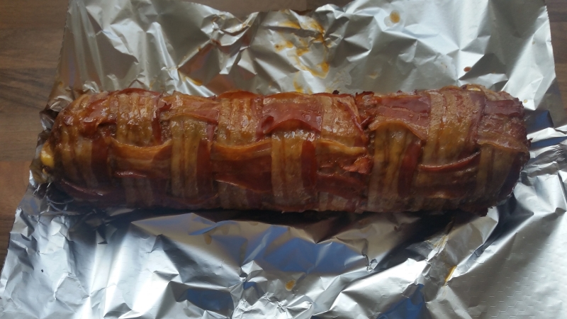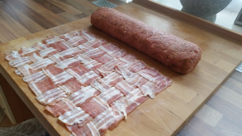 - Die Hackfleisch-Rolle aus der Frischhaltefolie befreien und in den Bacon einrollen.