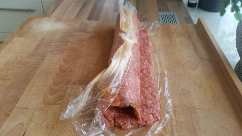 - In der Frischhaltefolie kann man die Hackfleisch-Rolle sehr flexibel noch in der Länge anpassen, falls das Bacon-Netz eine andere Breite hat.