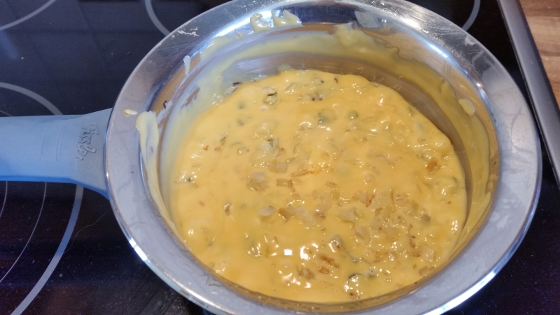 - Zwiebeln und Jalapenos zum geschmolzenen Käse geben und verrühren.