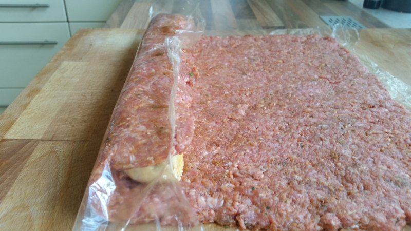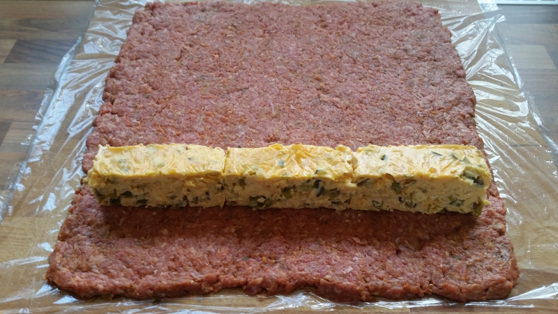 - Hackfleisch auf Frischhaltefolie mit dem Nudelholz ausrollen.