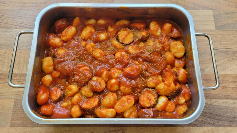 Da Currywurst im Supermarkt nur in 3er- oder 5er-Packungen verkauft wird, bleibt schon mal eine übrig. Dafür gibt es jetzt den Gnocchi Currywurst Auflauf.