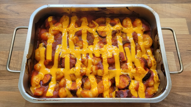 Currywurst dazu geben.