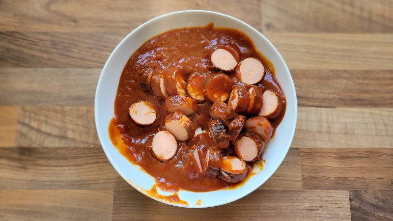 1 Currywurst mit Sauce vom Vortag