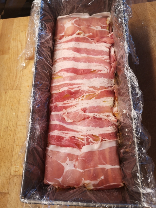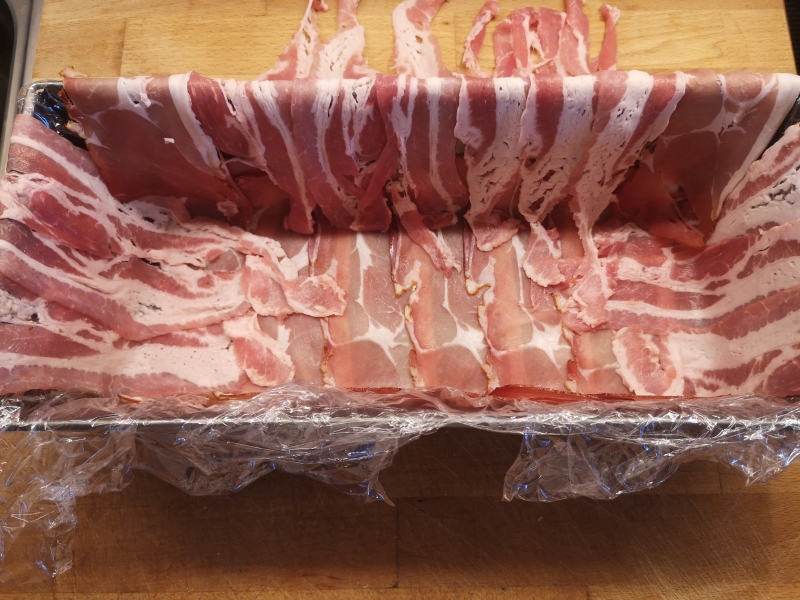 - Boden und Seiten der Kastenform mit Bacon auslegen, dabei den Bacon an den Seiten so lang lassen, dass man den Bacon über die ganze Lasagne umklappen kann.