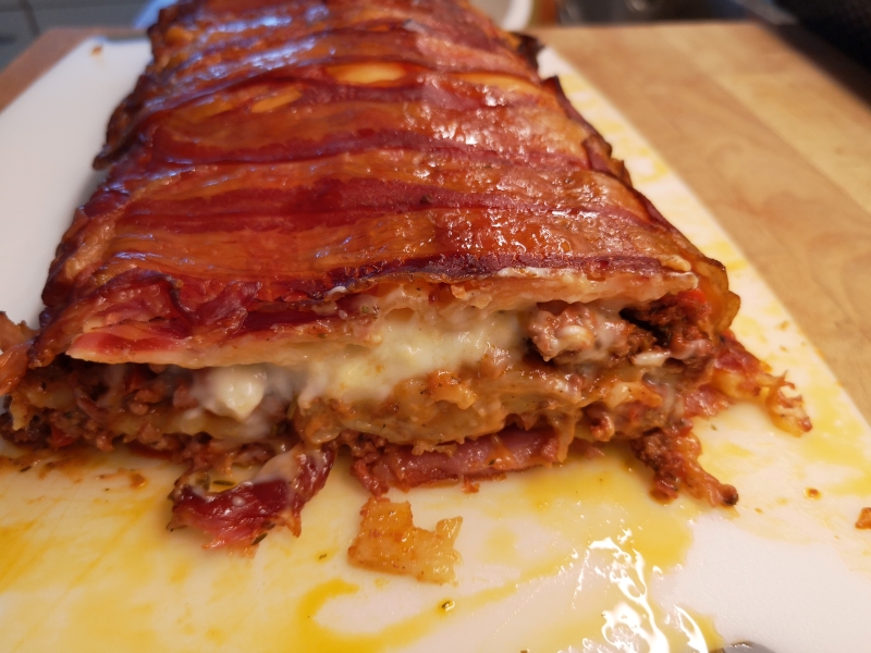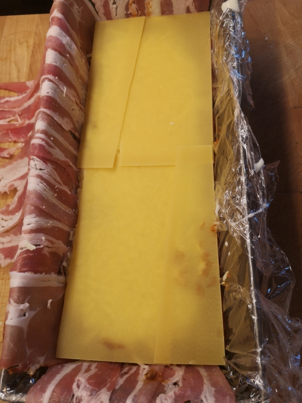 - Den Bacon über die Lasagne-Platten umschlagen.