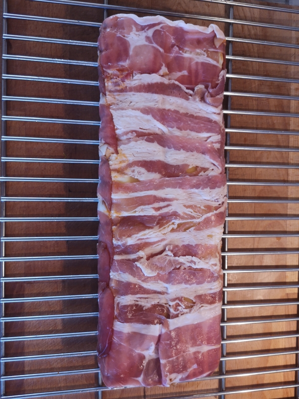 - Die Frischhaltefolie über den Bacon umschlagen.