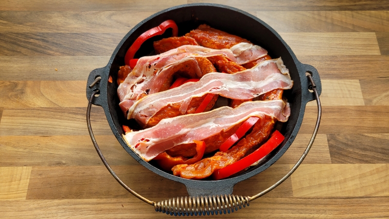 Mit Paprika, Sauce und Bacon.
