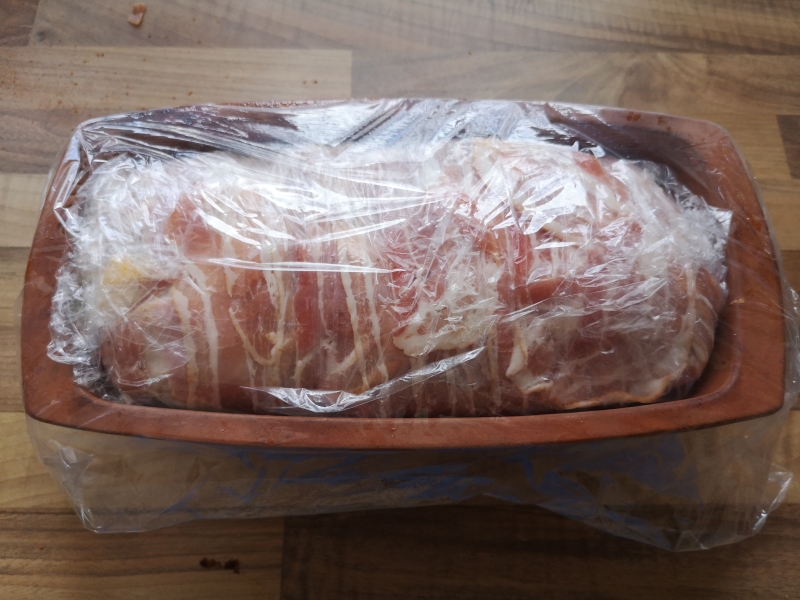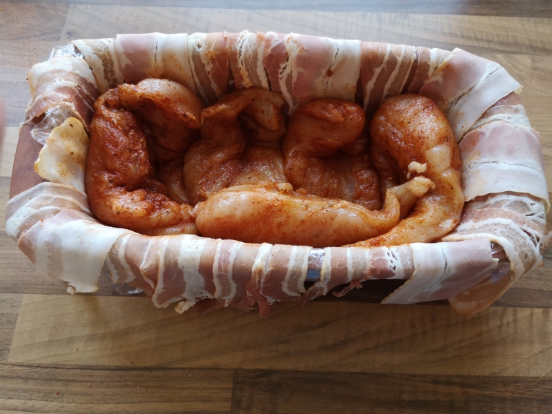 Kastenform mit Folie und Bacon und Hähnchenbrust.