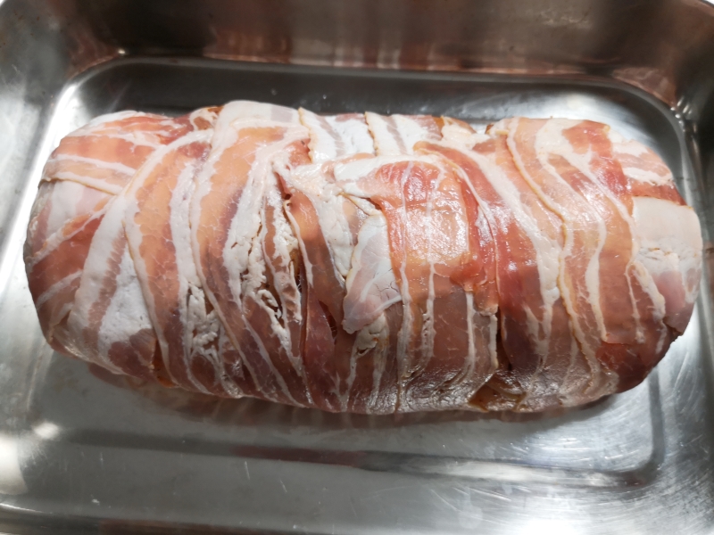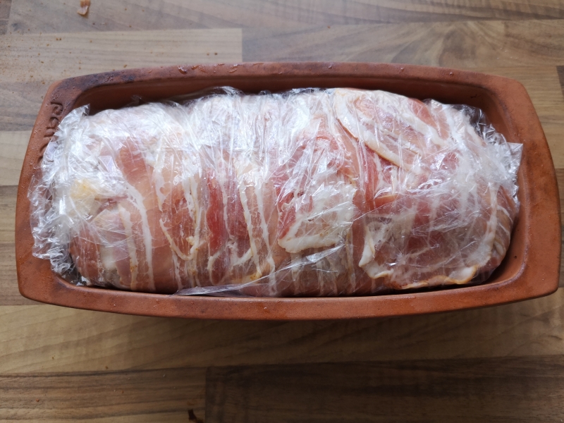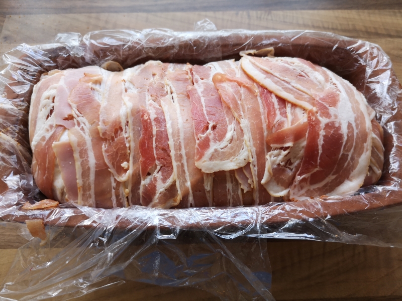 - Boden und Seiten der Kastenform mit Bacon auskleiden.
