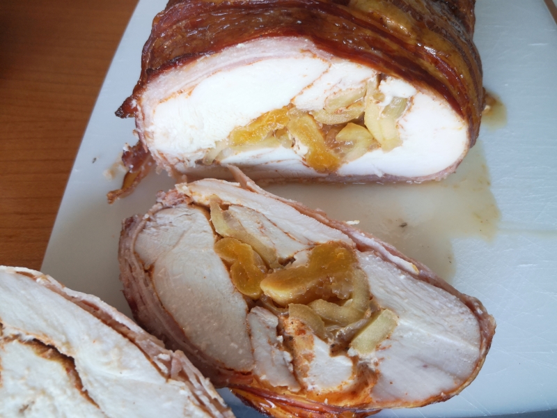 - Die Hähnchen-Rolle aus der Frischhaltefolie befreien.