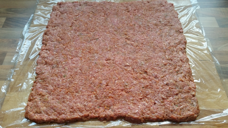 9. Hackfleisch auf Frischhaltefolie mit dem Nudelholz ausrollen.
