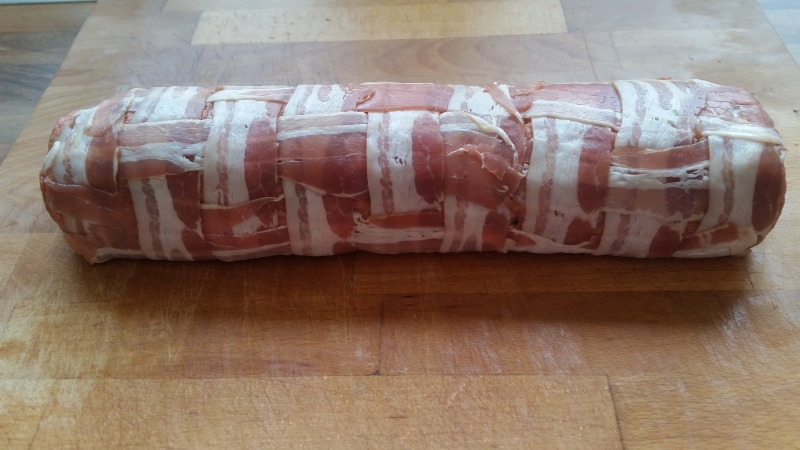 15. Die Hackfleisch-Rolle aus der Frischhaltefolie befreien und in den Bacon einrollen.