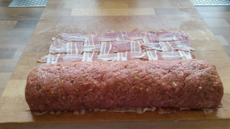 14. In der Frischhaltefolie kann man die Hackfleisch-Rolle sehr flexibel noch in der Länge anpassen, falls das Bacon-Netz eine andere Breite hat.