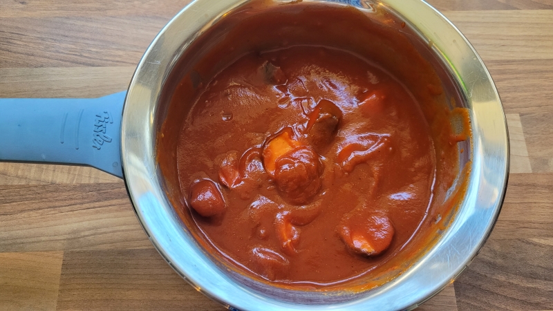 Currywurst mit Currysauce und passierten Tomaten aufgewärmt.