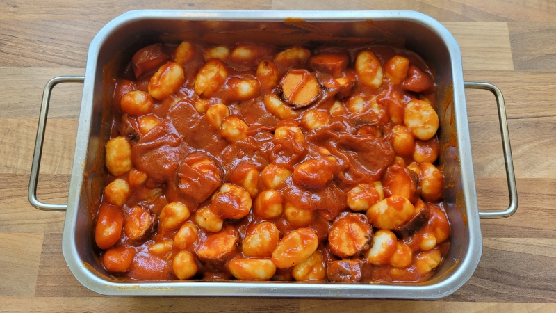 Da Currywurst im Supermarkt nur in 3er- oder 5er-Packungen verkauft wird, bleibt schon mal eine übrig. Dafür gibt es jetzt den Gnocchi Currywurst Auflauf.