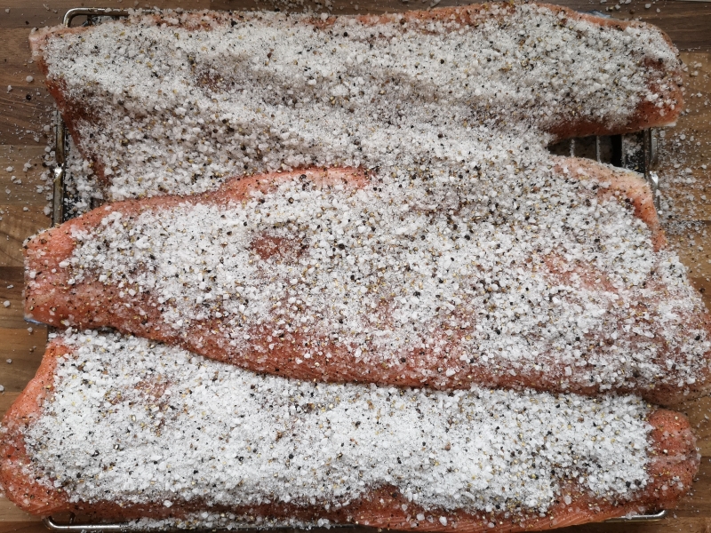 2. Das Lachsfilet mit der Hautseite nach unten auf einen Rost legen und mit der Beizmischung bedecken.