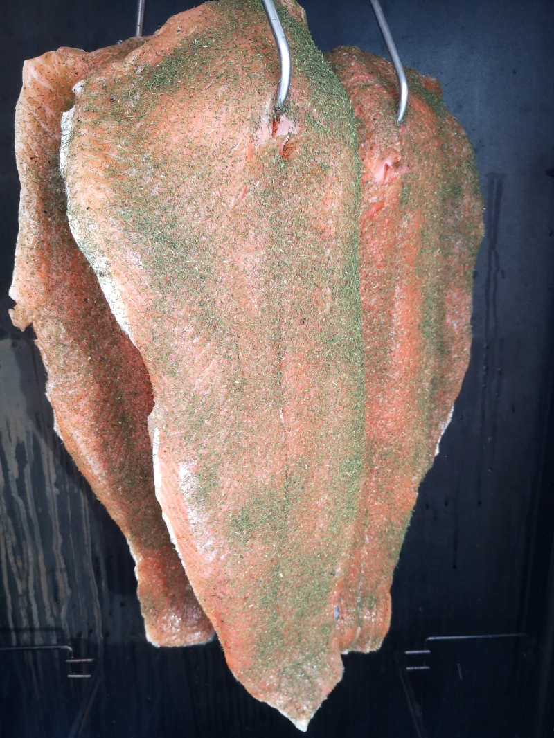 5. Nach Belieben z.B. mit Dill würzen. Mit Hilfe eines Kaltrauchgenerators bzw. einer Räucherschnecke wird der Lachs bei Temperaturen zwischen 0-25 °C geräuchert. 2 bis 3 Räucherdurchgänge mit jeweils 6 Stunden sorgen für intensiven Rauchgeschmack. Zwischen dem Räuchern sollte man mind. 6 Stunden Pause machen.