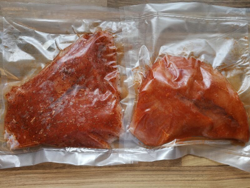 Putenbrust gewürzt und vakuumiert.