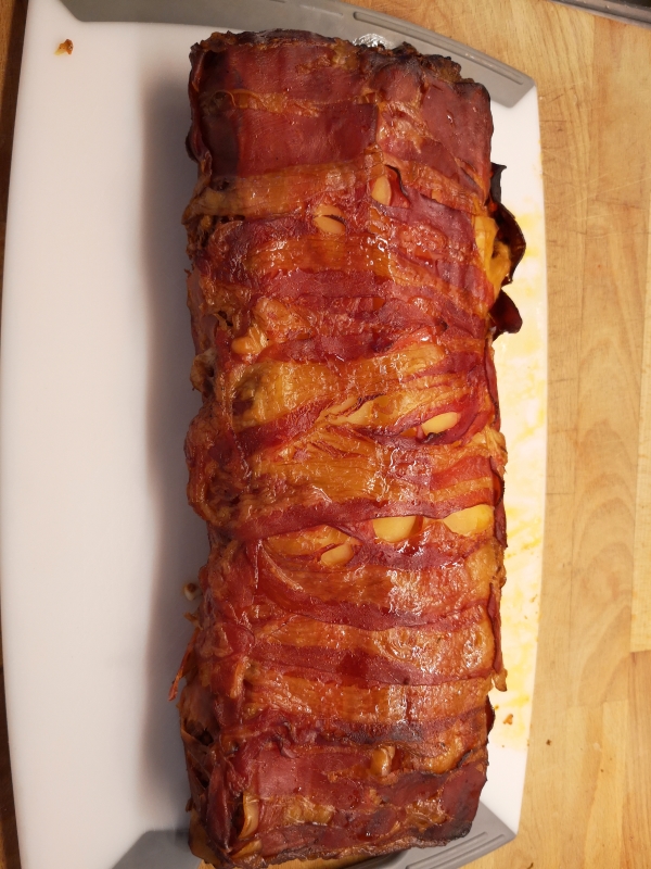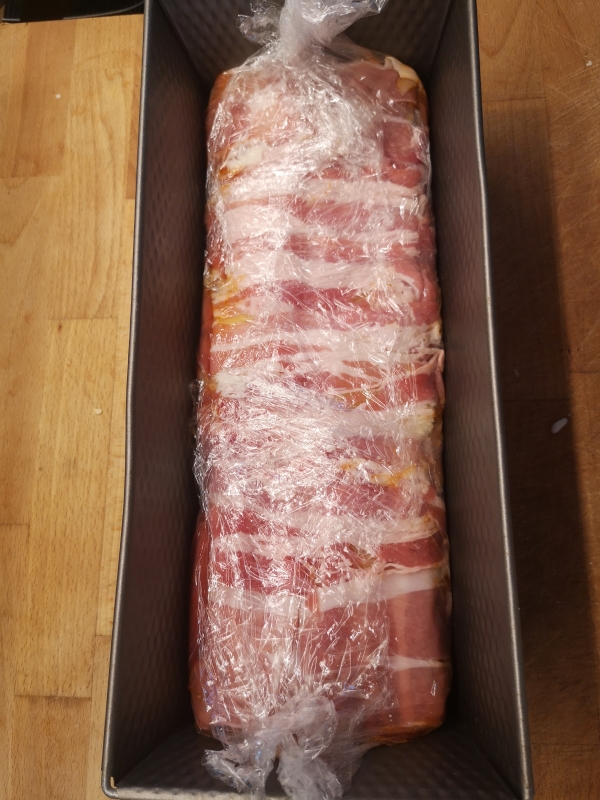 - Die Frischhaltefolie über den Bacon umschlagen.
