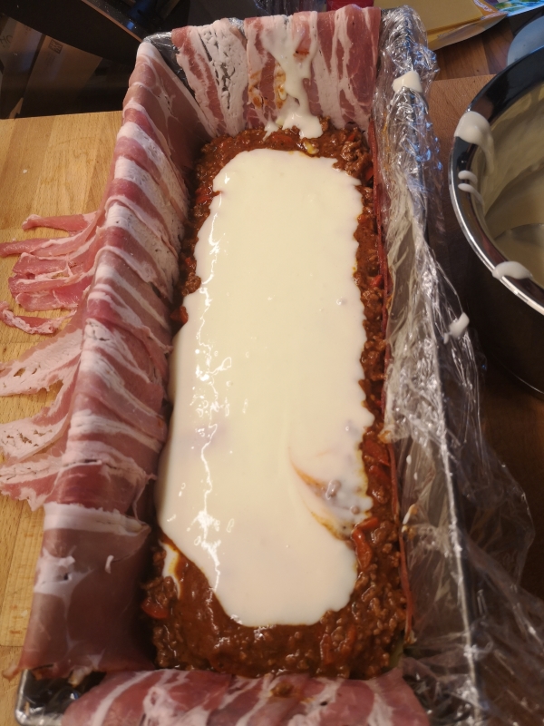 - Boden und Seiten der Kastenform mit Bacon auslegen, dabei den Bacon an den Seiten so lang lassen, dass man den Bacon über die ganze Lasagne umklappen kann.
