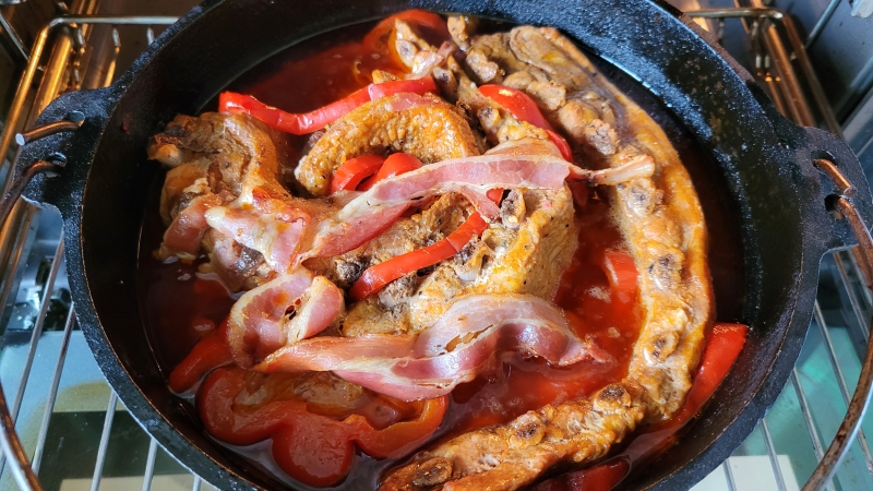 Mit Paprika, Sauce und Bacon.